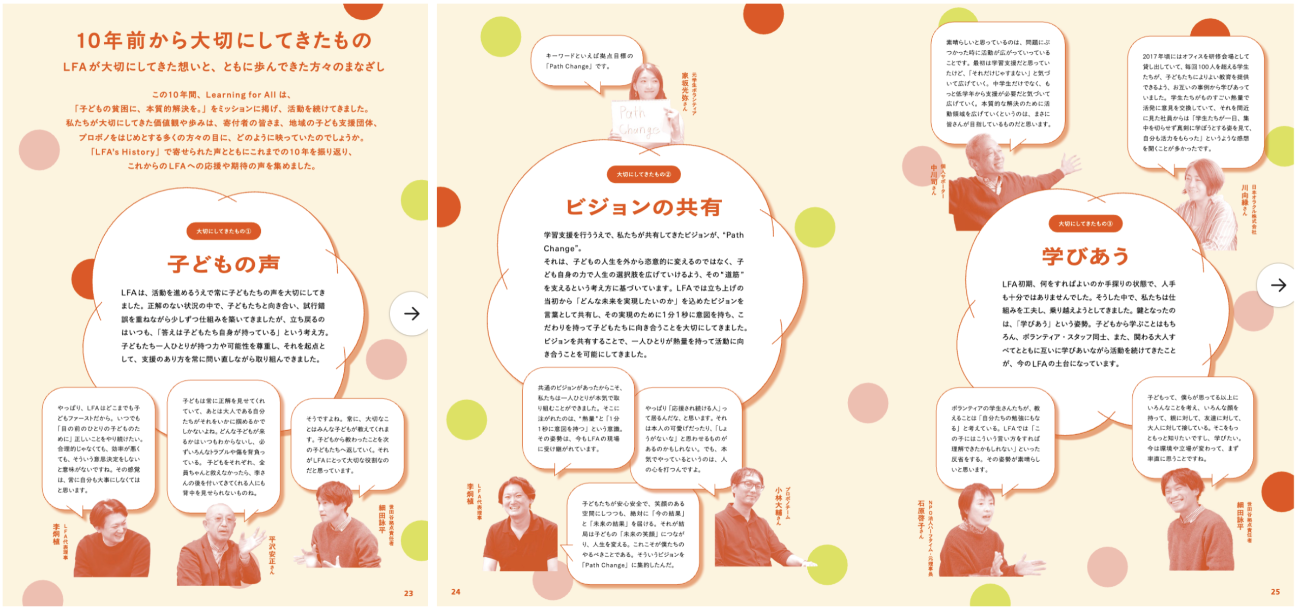 本報告書では、LFAが大切にしてきた価値観や姿勢を振り返るとともに、これまでともに歩んできた寄付者の皆さま、地域団体、プロボノの皆さまの声も掲載しています。