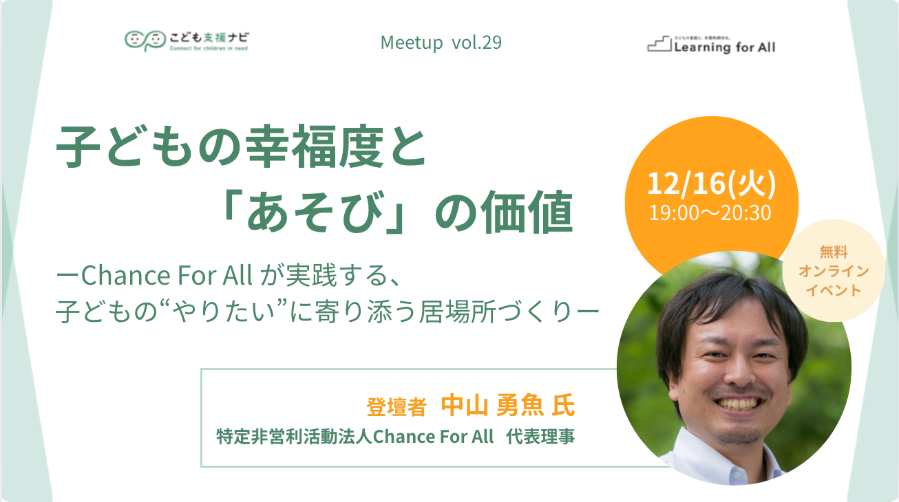 こども支援ナビ Meetup vol.29「子どもの幸福度と「あそび」の価値:Chance For All が実践する、子どもの”やりたい”に寄り添う居場所づくり」を12月16日(火)午後7時より開催します!