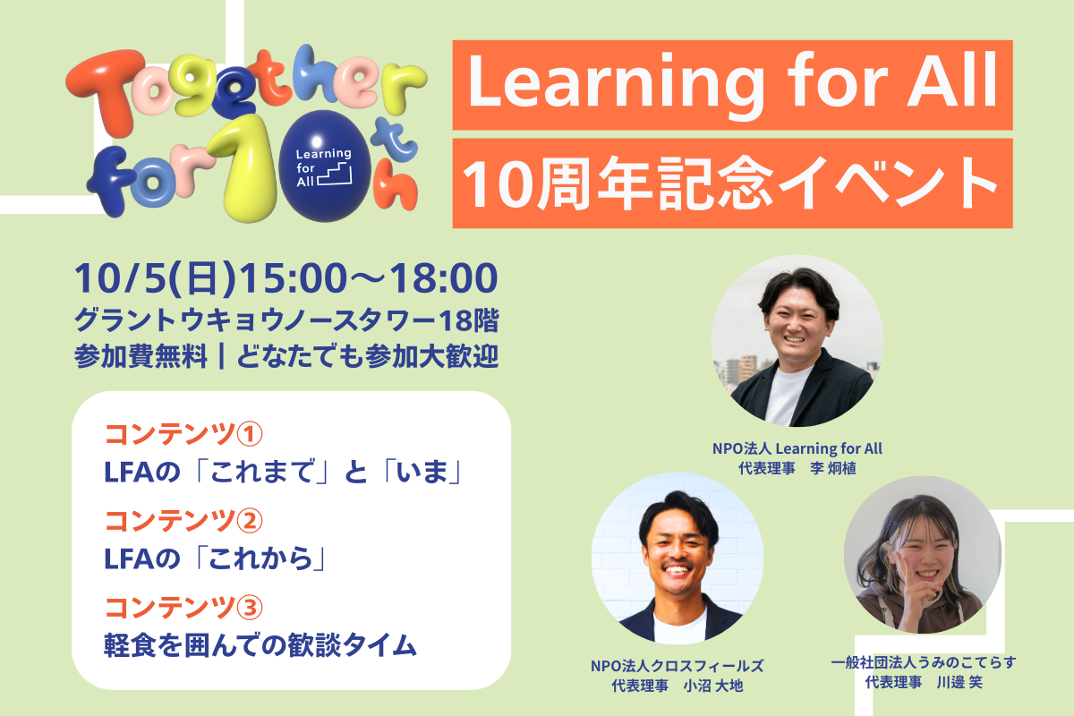 LFAは、2024年に設立から10周年という節目の年を迎えました。10周年記念の締めくくりとして、6年ぶりの大規模な記念イベントを開催する運びとなりました。LFAが向き合ってきた子どもたちの現状やこれまでの歩み、そしてこれからの取り組みについてお伝えします。どなたでも参加大歓迎です。皆さまのご参加をお待ちしております。