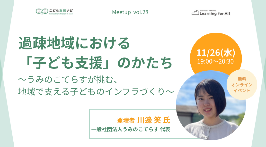 こども支援ナビ Meetup vol.28「過疎地域における「子ども支援」のかたち〜うみのこてらすが挑む、地域で支える子どものインフラづくり〜」を11月26日(水)午後7時より開催します!