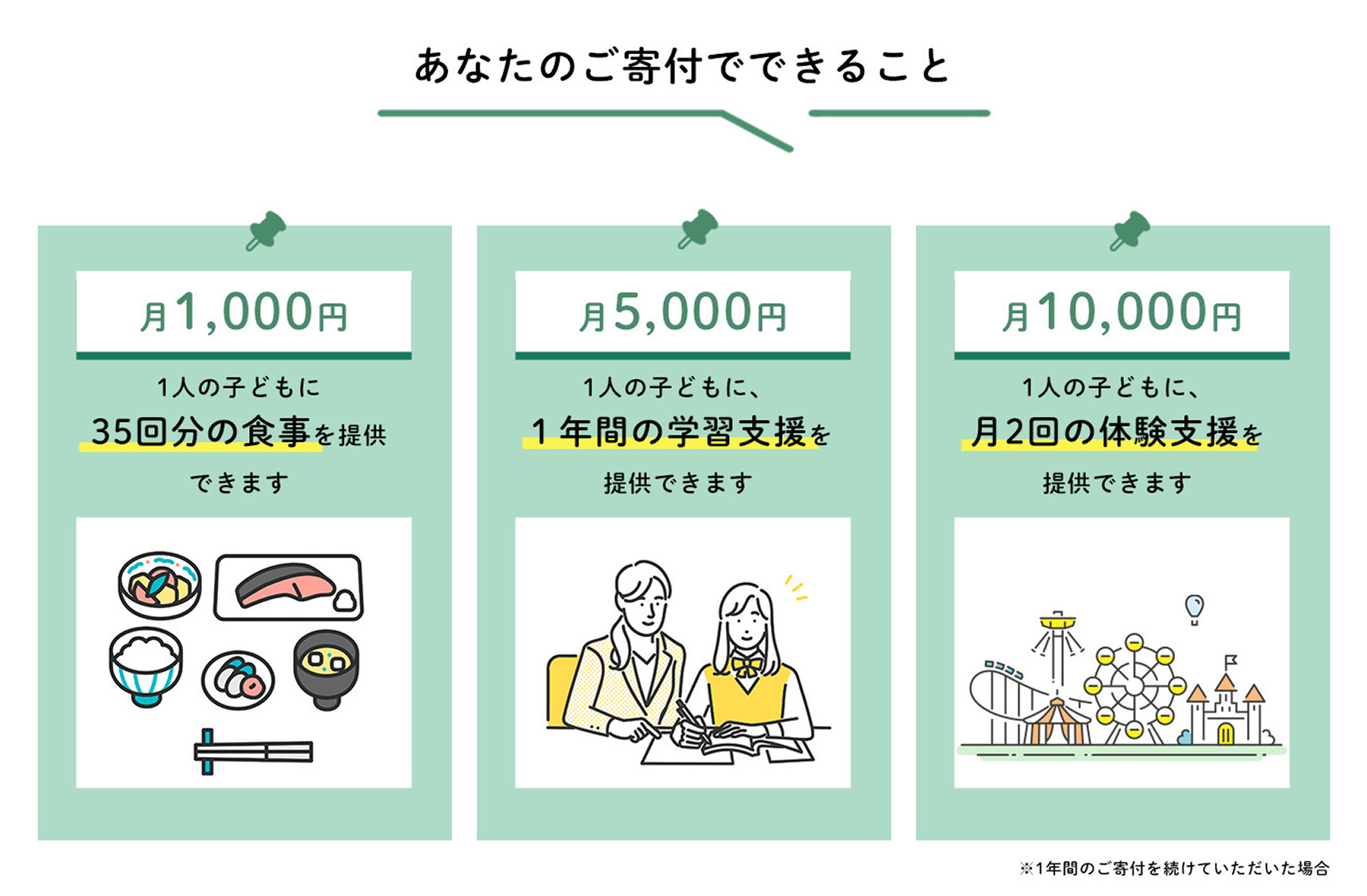 ・本お申込み時に、初回の寄付が課金されます。2回目以降は、毎月1日に寄付が課金されます。
